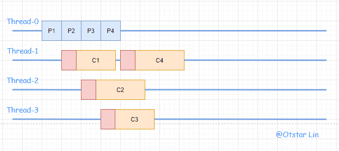 ProduceConsume:将 IO 的生产和消费统一由一个线程来完成,不断循环生产和消费的过程。很明显,这种模式有个很严重的问题,后面的 IO 事件要等待前面的 IO 事件完成,这样的效率明显很差,越后面的 IO 事件需要等待的事件就越长。