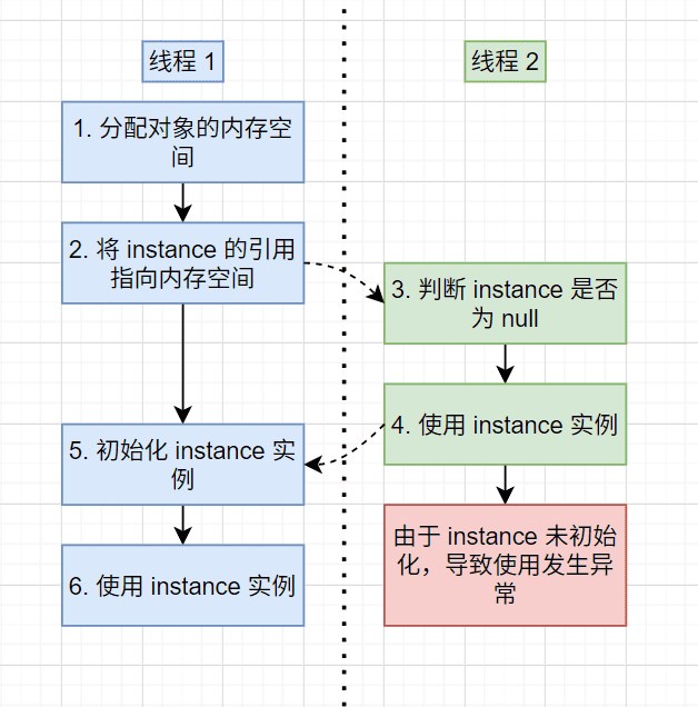 当指令重排后,线程 1 instance = new Singleton() 执行完 2 步骤后,此时进行线程切换,线程 2 getInstance() 当走到 if (instance == null) 的时候,由于 instance 变量已经被赋值了,那么就获取成功,返回,但是此时 Singleton 对象并未初始化,如果这时候使用该对象,那么就会导致抛出 NPE 异常。